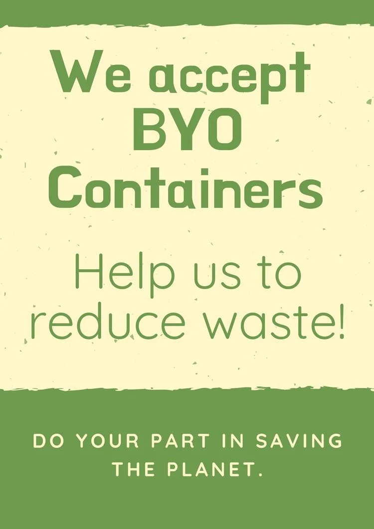 You should know that 3 New Plymouth cafes are testing our messaging, as shown in the sign below, to help customers remember to bring their own takeaway containers.